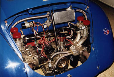 2.4 litres of air-cooled power, built from specialised parts. It is a wet sump unit, which has been enlarged to compensate for the missing cooling fan. Oil is circulated through a free flow oil filter system.