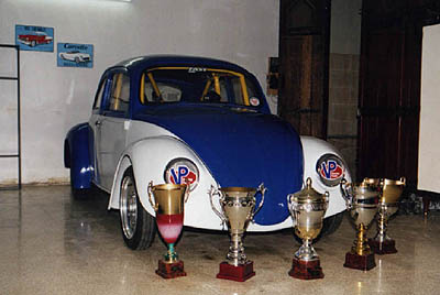 This hot bug is built around an early sixties' body shell with widened wheel arches. Note upright headlamp bowls and roll cage.
