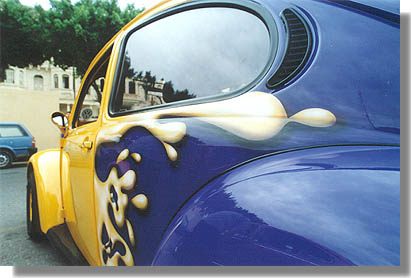 view of Noel's Yellow and Purple '72 Bug. Note the paint splash pattern