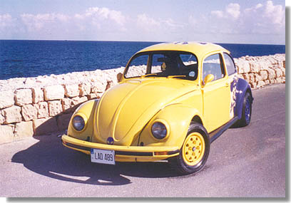 quarters front view of the '72 Bug showing colour coded bumpers, head lamp
