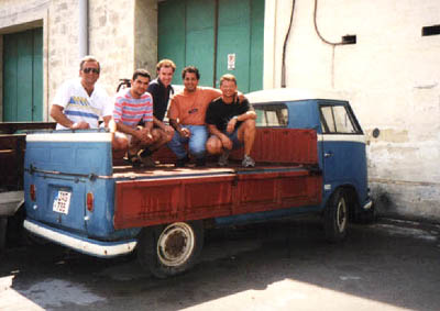 The Type 2 Pick up just before it was wheeled into its present lair, where it will eventually be restored. The entire V-Dubs Malta committee is squatting in the pick-up's rear.